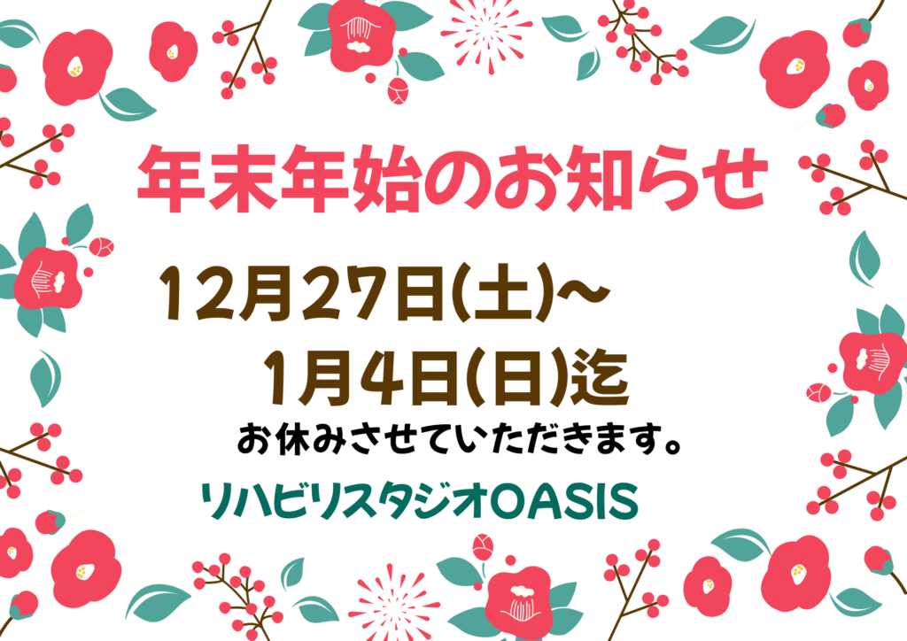 新年あけましておめでとうございます。 旧年中は当デイサービスの運営にご理解・ご協力を賜り誠に有難うございました。本年もご利用者様お一人お一人の健康を守り、オアシスを選んでよかったと思っていただけるよう、スタッフ一同、心を合わせ誠心誠意皆様... お知らせ